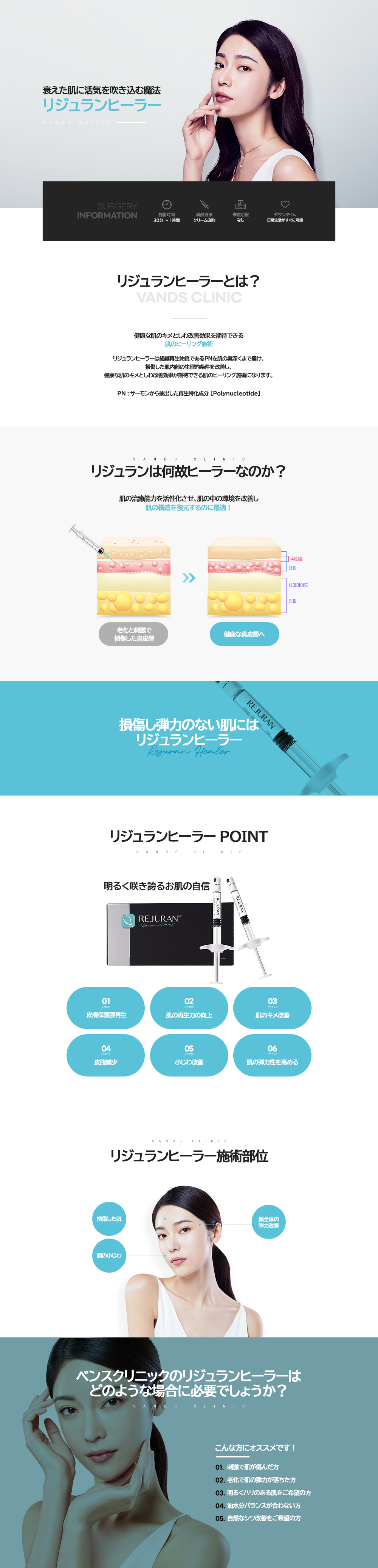 リジュランヒーラーは、生体適合物質であるポリヌクレオチド(PN、polynucleotide)という成長因子複合体です。 単純に表皮層に水分を供給するマスクパックとは異なり、薄くたるんだ肌の表皮層と真皮層の根本的な再生を働きかけ, 健康的でハリのある肌へと導く施術です。